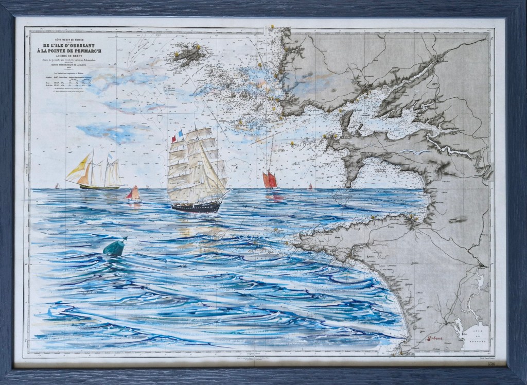 Principalement sur papier 300g mais aussi sur cartes marines anciennes… avec divers formats, de 30×30 à 120x80cm